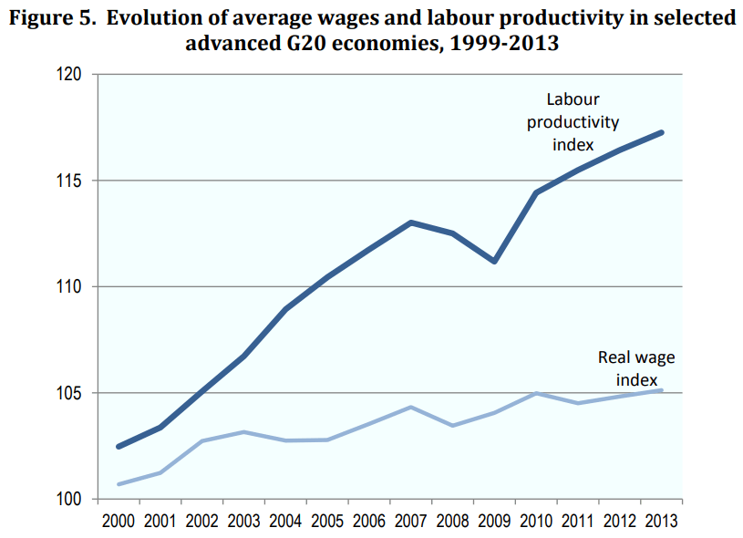 Most analyses of the growth in profits and decline in relative wages note that labor productivity has continued to rise by 2% or more annually, but labor has received almost no portion of those gains in the last 30 years.