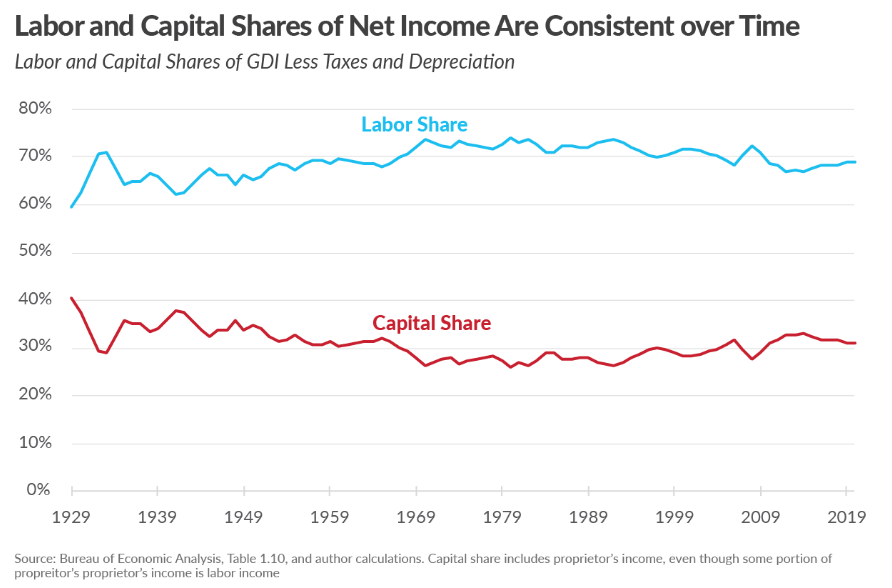 A right-leaning think tank adjusts the data and claims that labor’s share remains constant in the long-run. The Tax Foundation does delve into the various measures of income and provides arguments for their preferred measure.