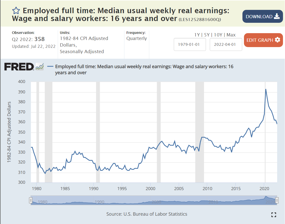 Median REAL, inflation-adjusted, earnings remained flat at $330/week from 1979 through 2014, a period of 35 years! This is during periods where profits were growing at 4% per year in REAL terms. In the last 8 years, REAL wages have increased by 9%, a bit better than 1% per year on average.