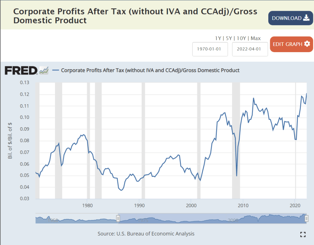 Corporate profits fluctuated in the 4-6% of GDP range from 1947 through 2000. Profits jumped up to 10% of GDP by 2010 and have largely remained at this two-fold elevated level for a decade. Profits reached a new record of 12% in 2022!