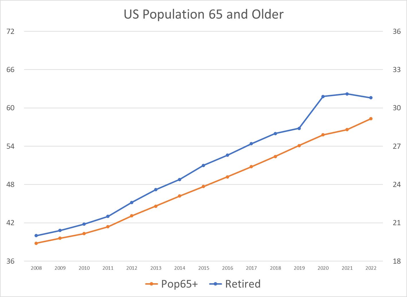 The retired 65+ population has grown a little faster than the total 65+ age group. The initial pandemic impact in 2020 was a 5% increase in the retirement rate, indicating about a 2.6M increase in early retirements in 2020.