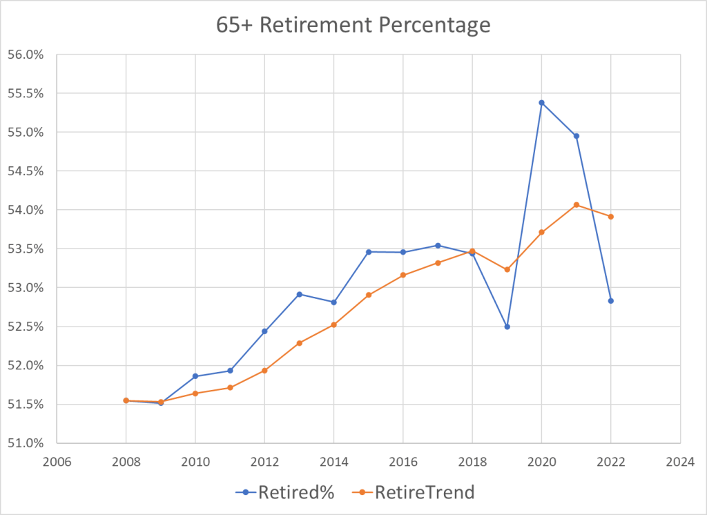 The retirement rate in 2020 was about 2% higher than the trend, indicating an extra 1.2M extra retirees. The percentage of retired individuals has since fallen back below the trend line.