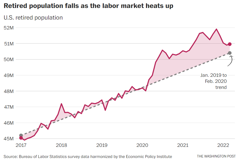 Later estimates indicated about 1M early retirements, and then a reversal in late 2021 – 22 as individuals chose to defer their retirements due to the uncertain economic conditions.