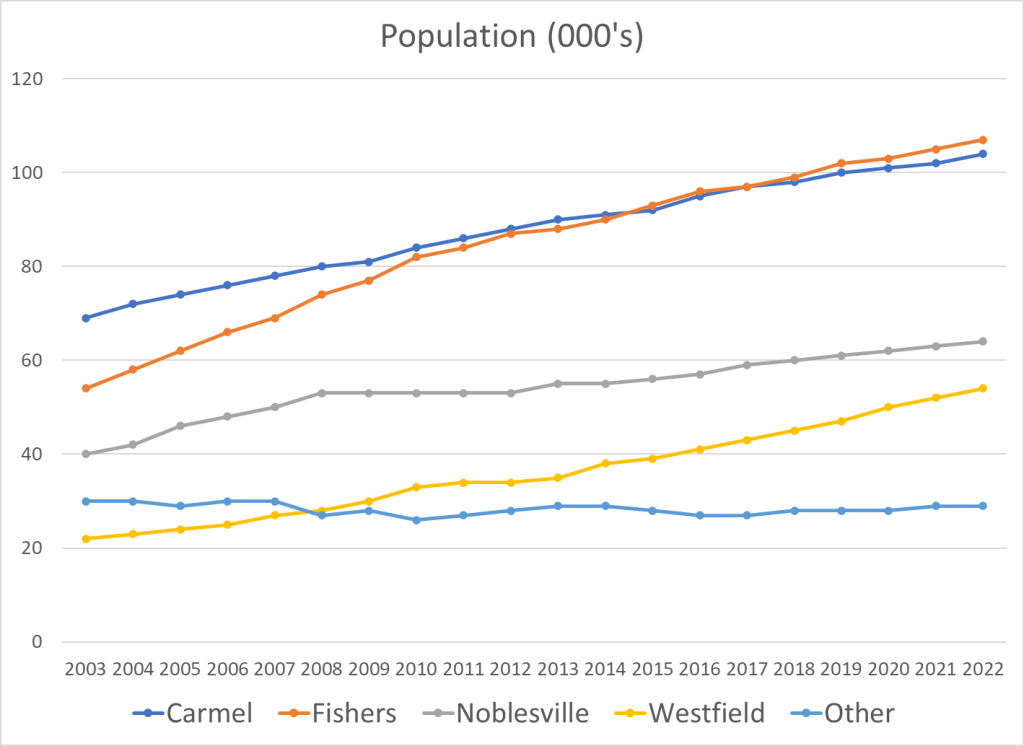 Fishers has overtaken Carmel to become the largest city. Westfield is growing at the fastest percentage rate, with Noblesville close behind.