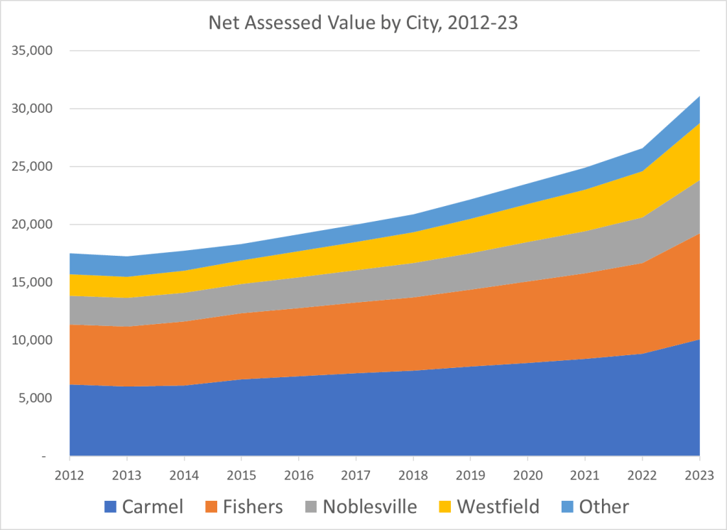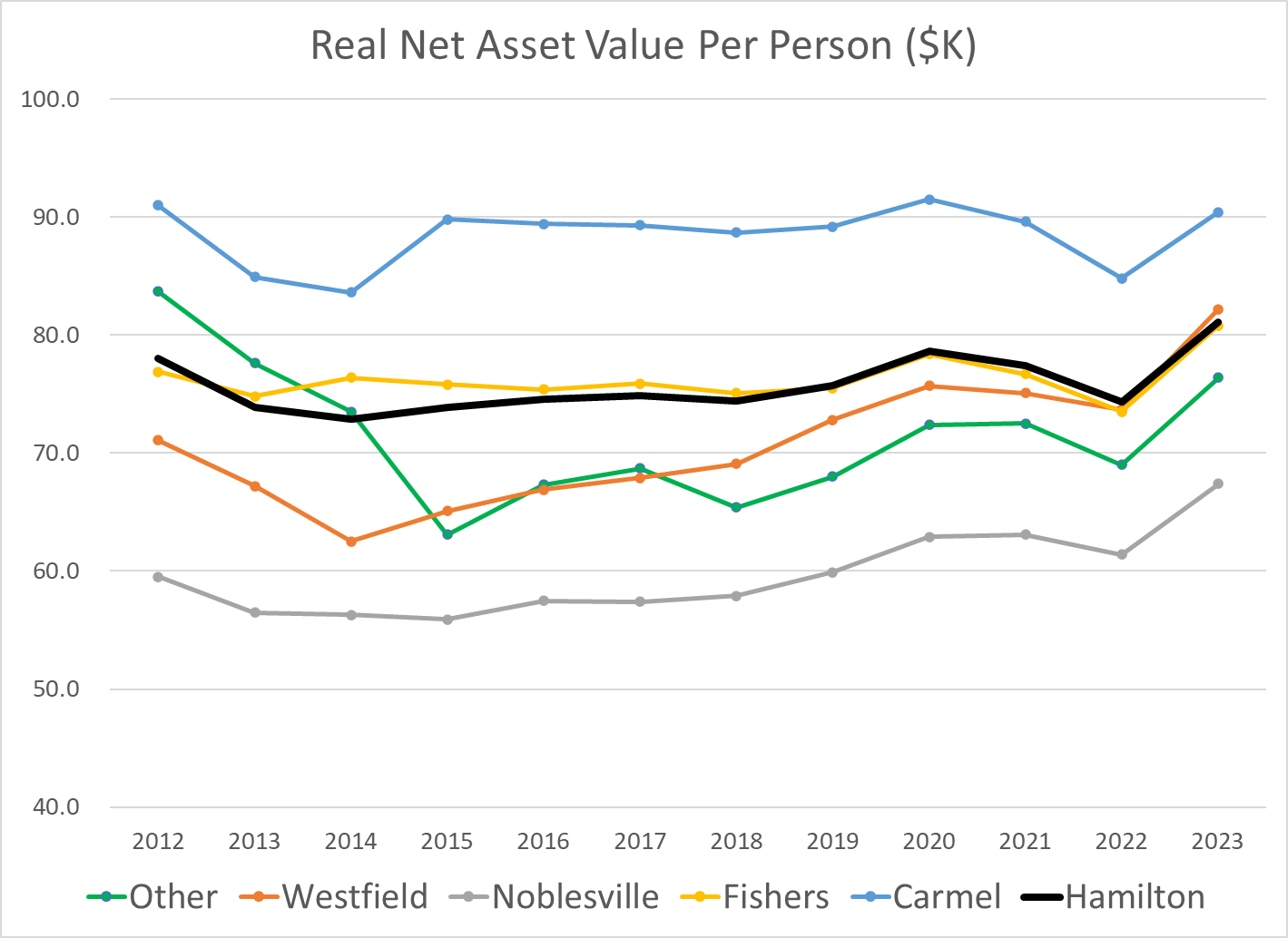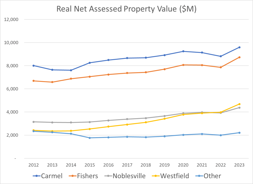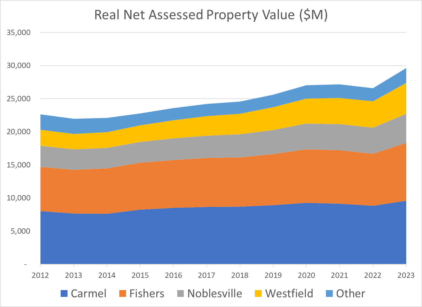 The real property value per person has remained roughly flat as the county has grown during the last decade. Carmel has higher real estate values and Noblesville has lower real estate values.