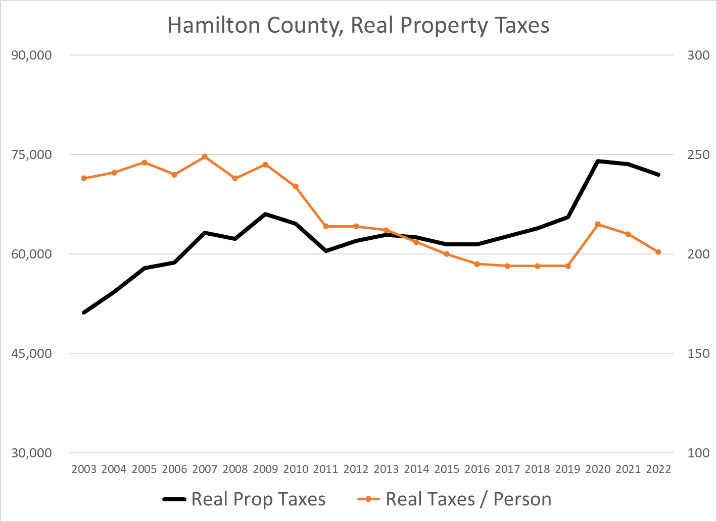 Real estate taxes levied by the county itself increased for payments due in 2020, but the real taxes per person remain 20% lower than they were in the “teens”. The county consolidated the provision of certain “emergency” services from the towns and cities in 2020.