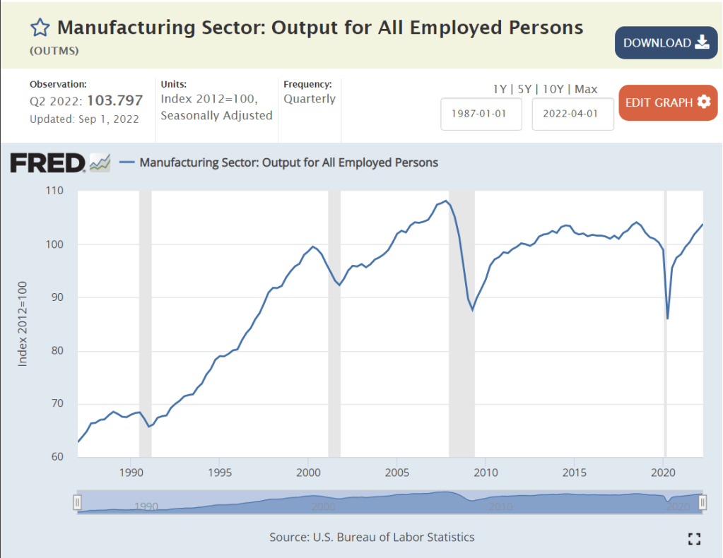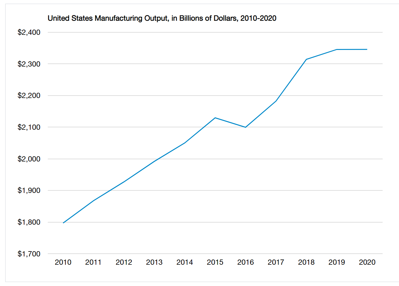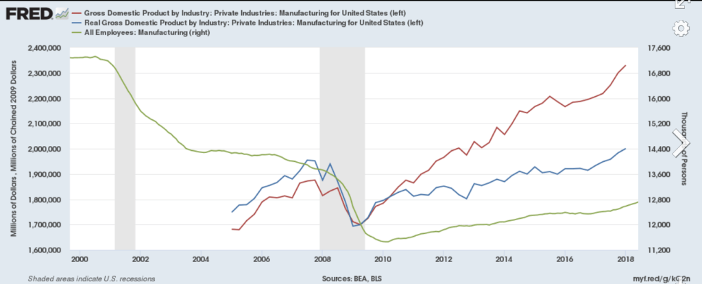 US manufacturing output continues to increase year over year, despite the reduction in employment.