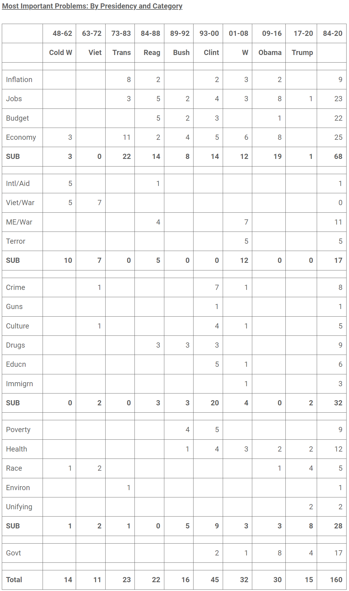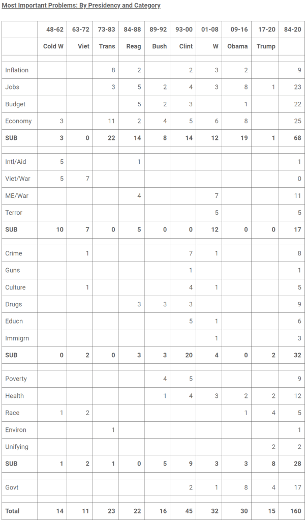 I’ve tracked the surveys back to 1948. I group the issues as policies versus institutions. I split the issues as foreign and domestic. I split the domestic issues as economic and social. I divide the social issues into those generally favoring Democrats versus Republicans. This summary shows the public’s views on the most important issues from 1948-2020 grouped by presidency.