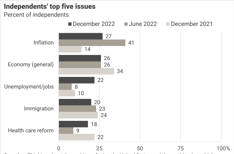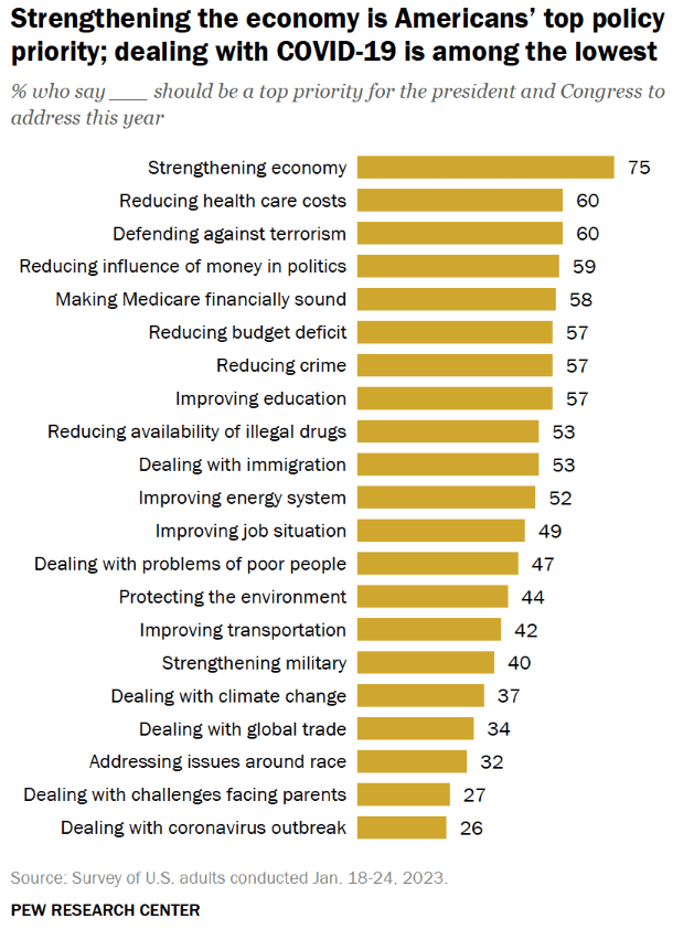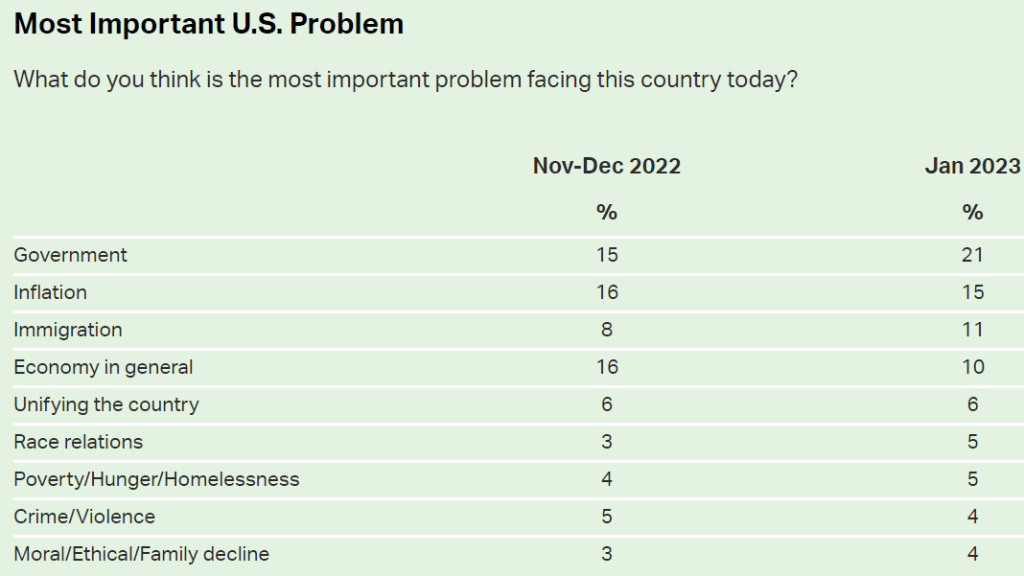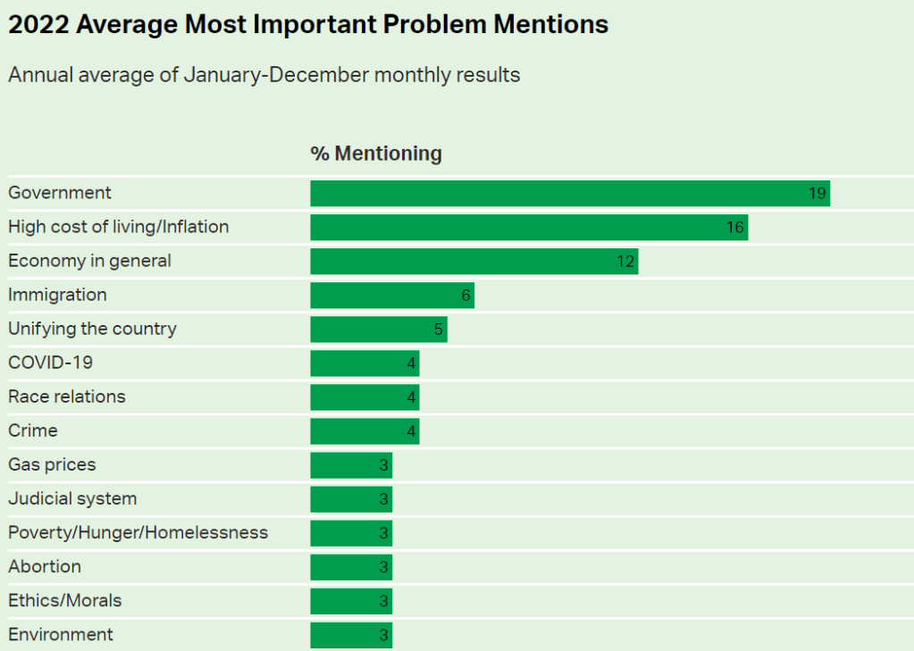 International issues, trade, war and terrorism have declined from 12 percent to zero. The middle eastern wars and “war on terrorism” have left most Americans with little appetite for foreign wars. Funding Ukraine’s war and imposing maximum sanctions against Russia are supported, but any escalation is taboo. Similarly, the country is ready to support a “tougher stance” on China, but not ready for real escalation or a fight for Taiwan.