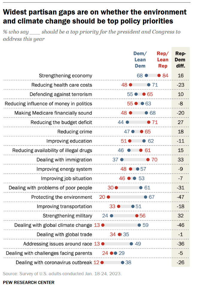Overall, I’d say that the 23% that identify government/politics as a top issue is roughly balanced between the two parties, with the concerns driven by quite different reasons.