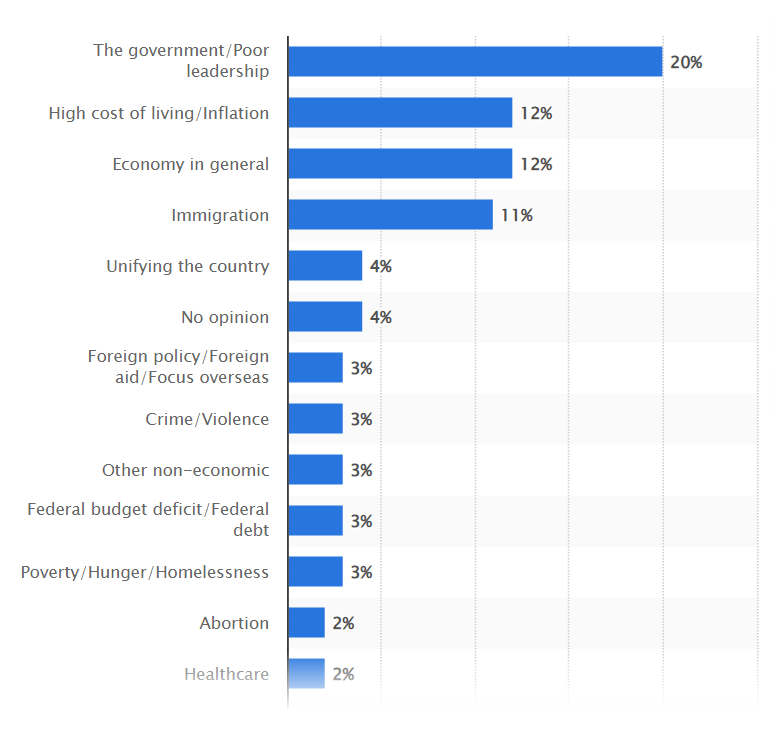 The overall “economy” was top-rated by 15% historically and 13% today. This has become a very partisan measure, with opposing parties criticizing the results of the incumbent presidents. The US economy has proved resilient and better at creating value than other countries throughout the last 75 years. Despite current Republican criticisms, Biden is winning this one.