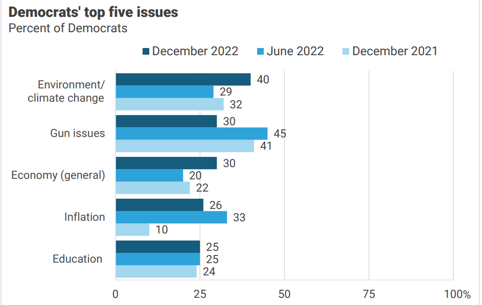 Democratic leaning wedge issues on guns, abortion and climate have grown from near zero to 13% as a top priority. Traditional concerns about race and inequality have not grown as priorities despite data and situations that might be expected to move public opinion.