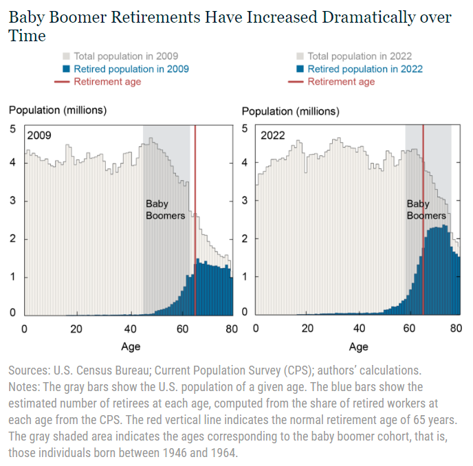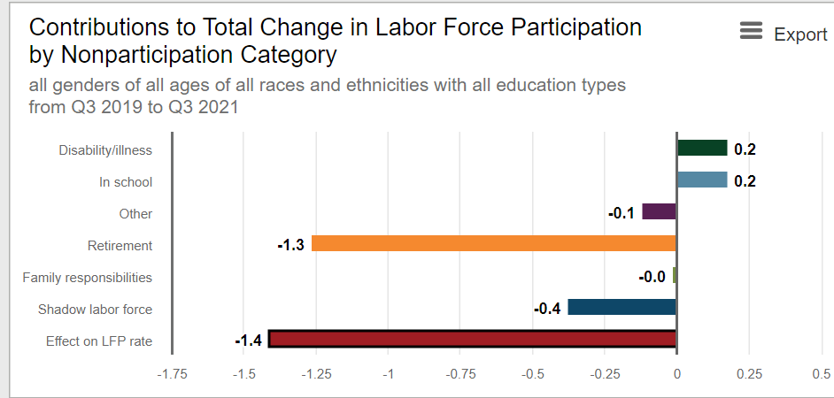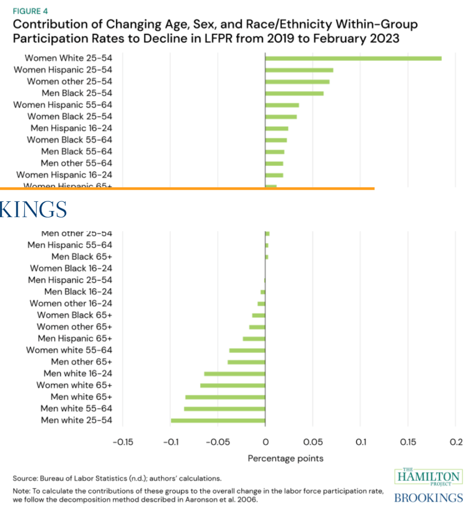 The male participation rate dropped by 1.5% but has only recovered by 0.5%, a major 1% below pre-pandemic times. Part of this is due to the long-term downward trend. Part of this is a “mix variance” driven by the very high number of “baby boomers” moving into normal retirement age or retiring early.