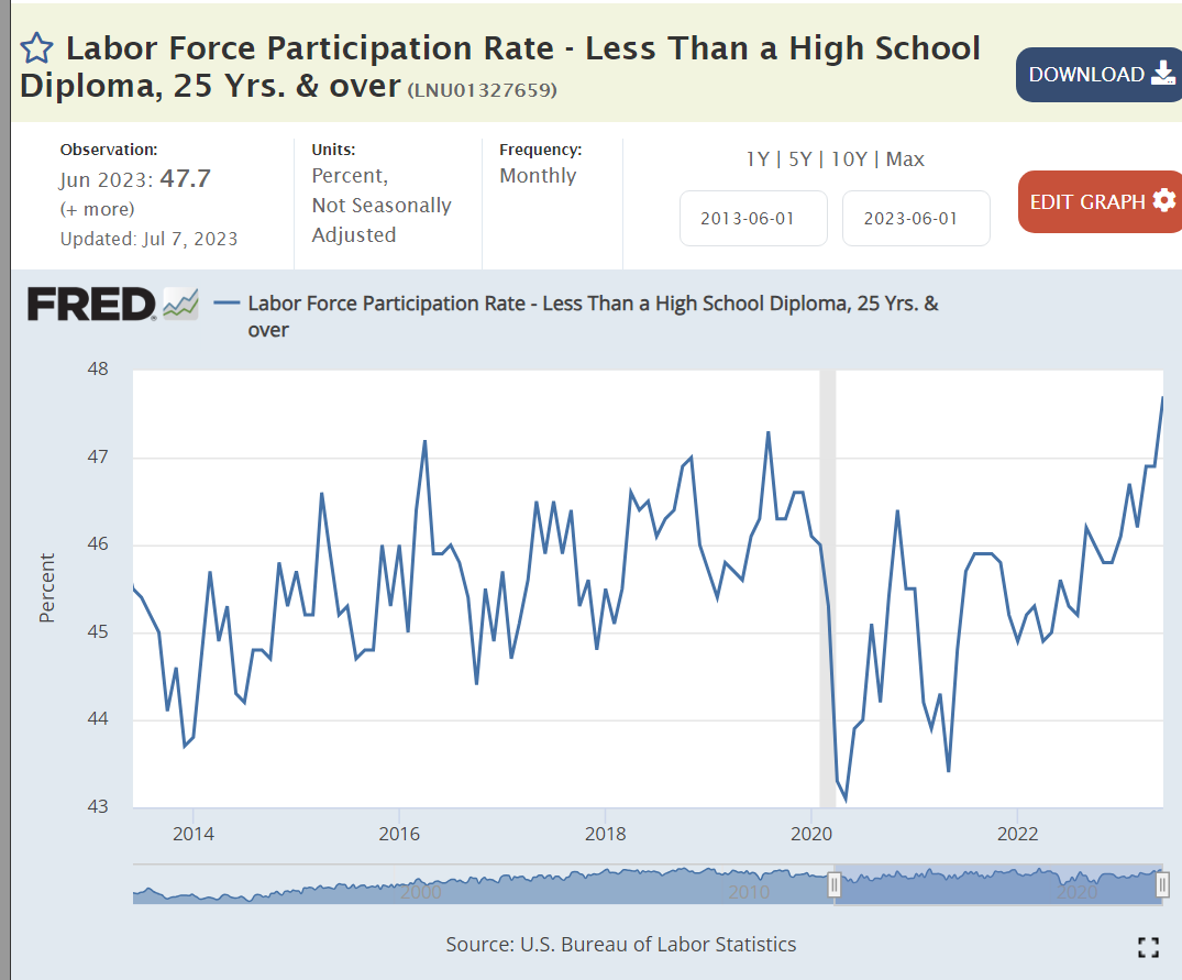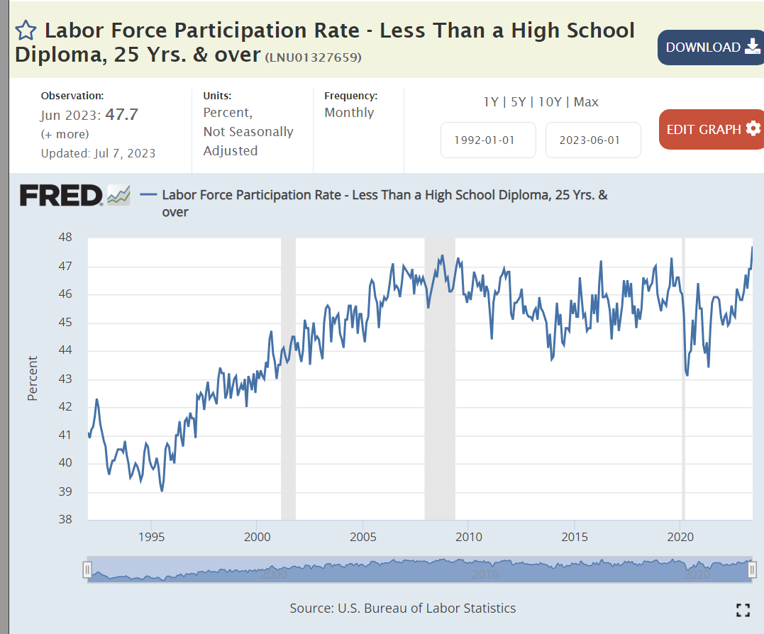 Non- high school graduates have added 1% to their labor force participation as real wages have increased.