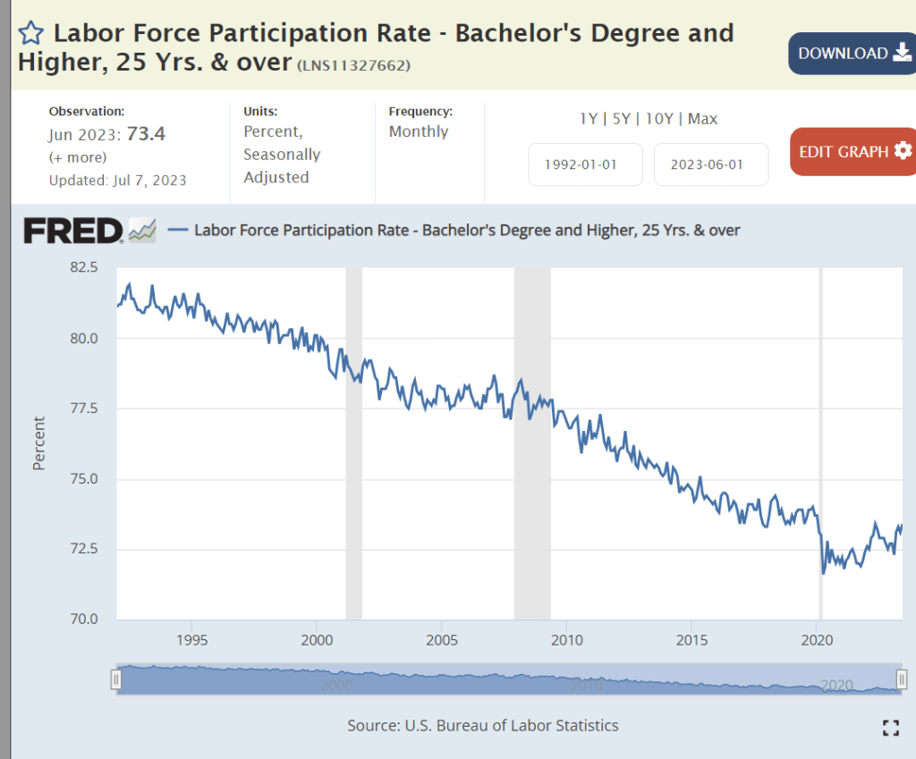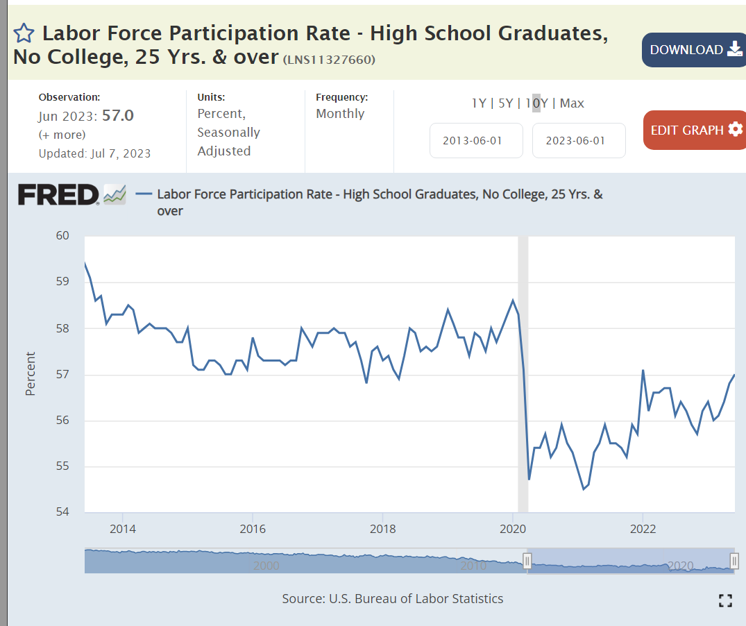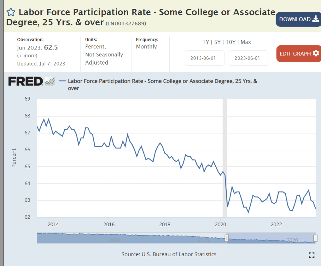 Individuals with some post-high school education, but not a bachelor’s degree, are in the middle range of US educational attainment. Their labor force participation rate had declined by almost 3 points in the 6 years before the pandemic, dropped by another 2 points during the pandemic and has not “recovered”.