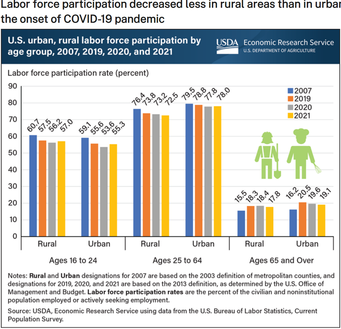 In general, rural labor markets have grown more slowly in the last 15 years and shown greater reductions in labor force participation. Some of the increased labor force participation in the last 2 years may reflect a recovery from these declines.