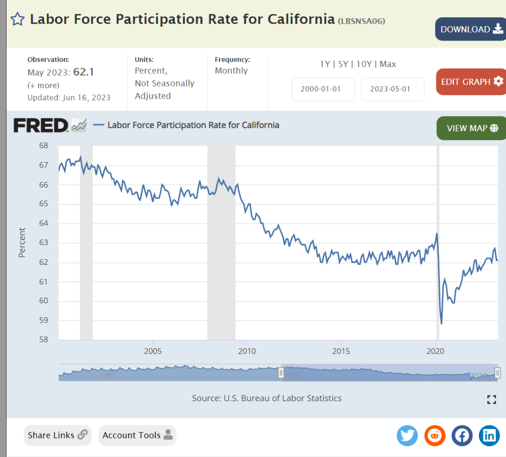 Most states show a similar pattern of labor force participation in the years before the pandemic, declining by 2-4% and afterwards recovering to their pre-pandemic level. California’s recovery has been slower. The New England states had an unusual increase in labor force participation before the pandemic and have not seen a major recovery after the pandemic.