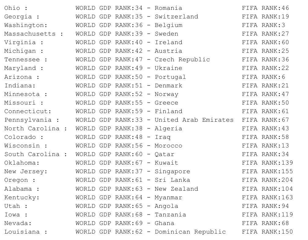 On the other hand, the US soccer team was ranked 11th globally. Three of the top 5 matching countries of Argentina, France and Spain deliver 1st, 2nd and 8th FIFA ratings. The middle 27 states matching nations provide another 8 world-class soccer teams in Belgium (3), Portugal (6), Morocco (13), Switzerland (19), Denmark (21), Ukraine (22), Austria (25) and Sweden (27).