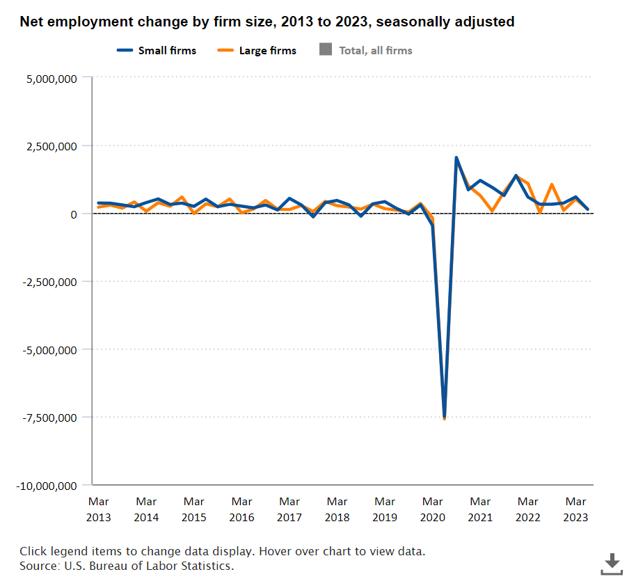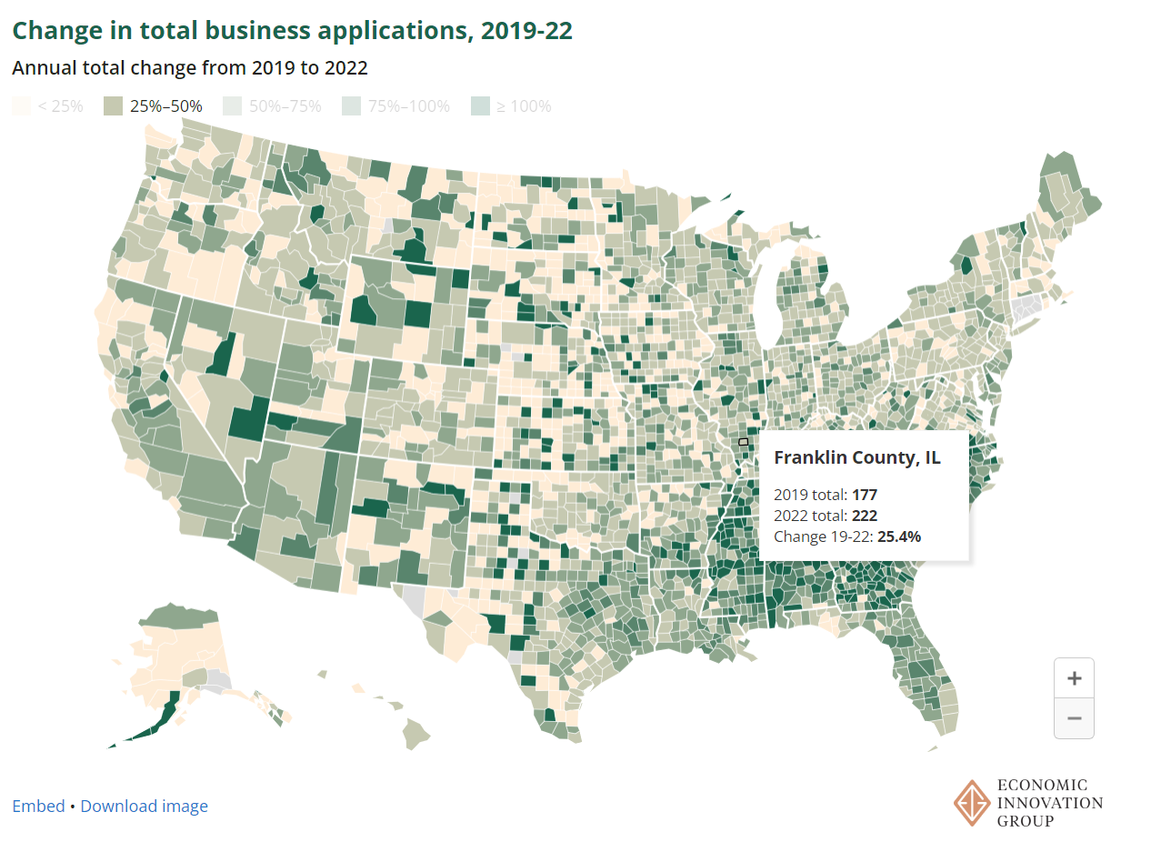 The IRS tracks new firm tax license applications. Most firms never really do business, but the ratio of initial applications to real firm creations has been stable through history. The Census Bureau has determined which subset of IRS license applications leads to real new firm creations. Both measures show the tremendous 50% increase between the pre-pandemic and post-pandemic eras.