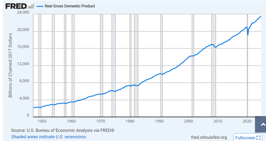 How could this happen? The independent Federal Reserve Bank has maintained a neutral monetary policy. We have not “shot ourselves in the foot” and we have implemented reasonable policies to offset external shocks. The federal government budget deficit has generally returned towards zero following depression periods. Automatic stabilizers and congressional action have addressed recessionary periods with enough stimulus to stop economic decline and restart recovery.