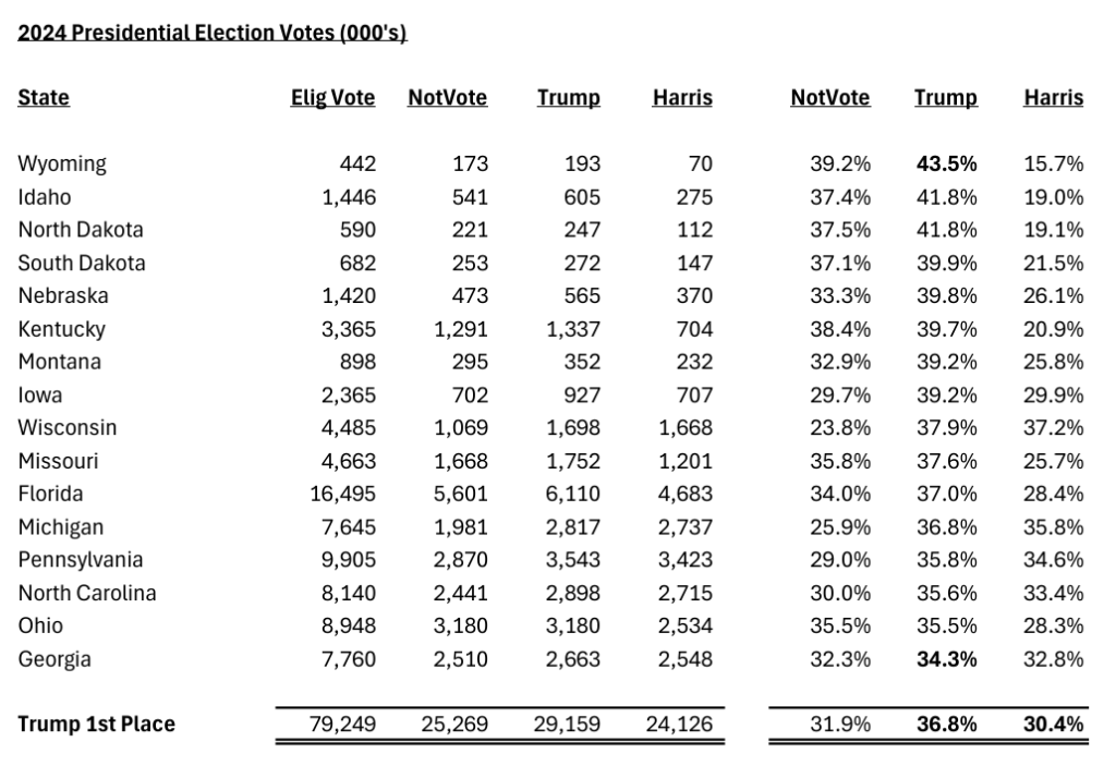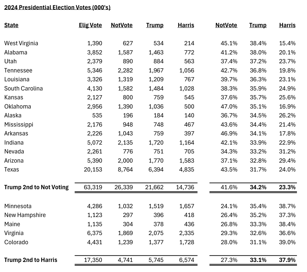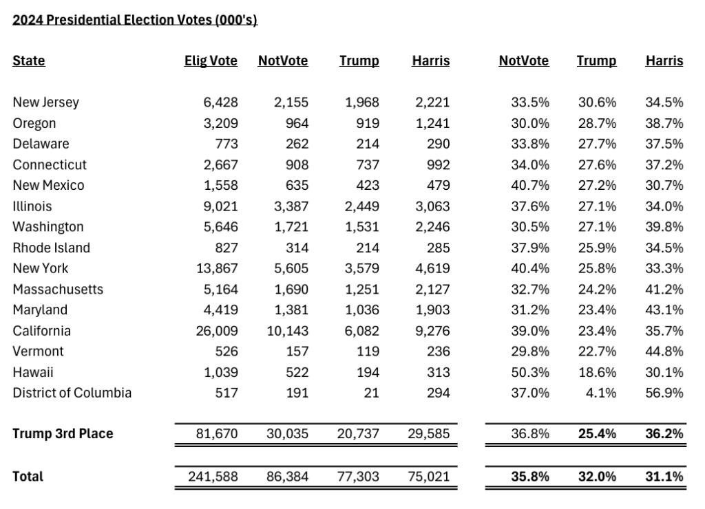 Trump finished in third place in 15 states, earning only 25.4% of the eligible vote. Harris won 36.2%, a shade behind the non-voters at 36.8%. This group of states had 33.8% of the eligible voters.