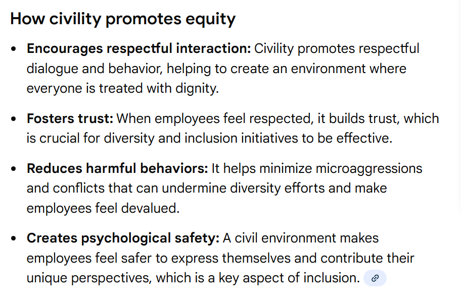 Civility is a social norm that influences behavior. It is a set of practices, skills, habits and behaviors. Civility requires self-awareness, self-management, social awareness and relationship management skills. It also requires communications, personal growth and problem-solving skills. This is a very heavy package of skills requiring a lifetime of personal investments. Yet, it is required for our representative democracy. Why would any individual choose to make this investment?