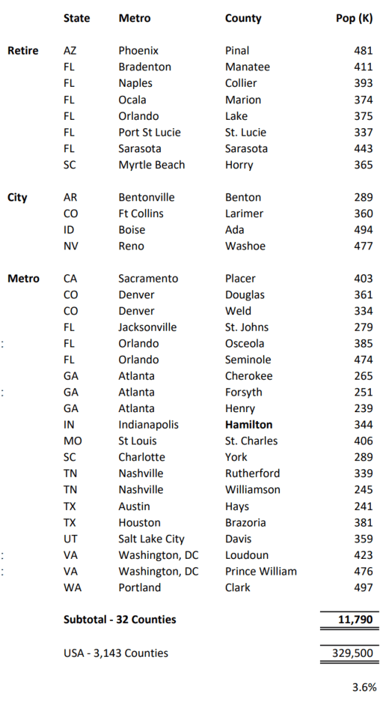 8 of the counties are Sunbelt retirement areas. 4 are smaller urban areas. 20 are suburban/exurban counties within larger metropolitan areas.