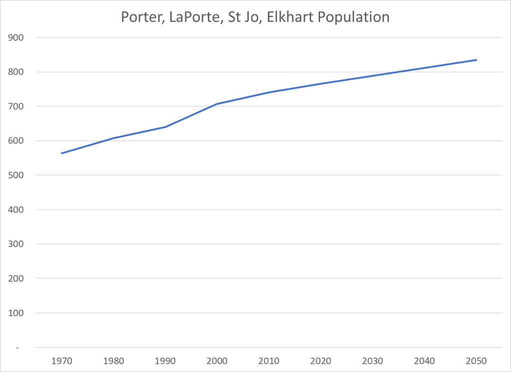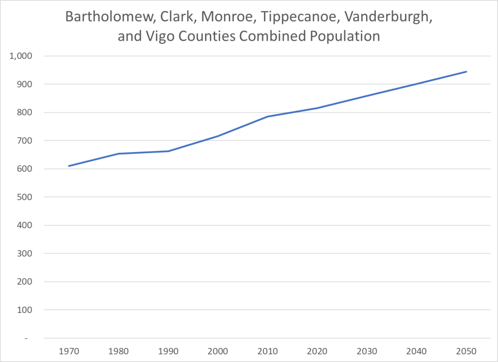The last official forecast of Indiana’s population was made in 2012, estimating growth from 6.5M in 2010 to 7.5M in 2050. The actual population was a little higher than this forecast in 2020. My forecast is for 7.7M in 2050.