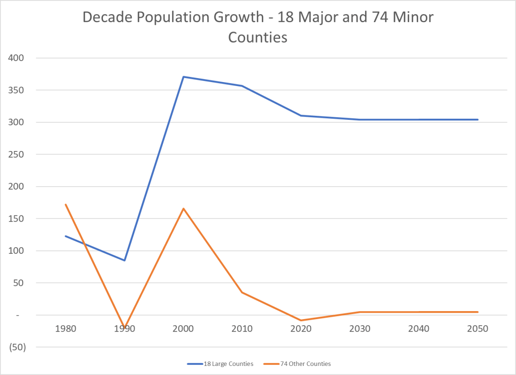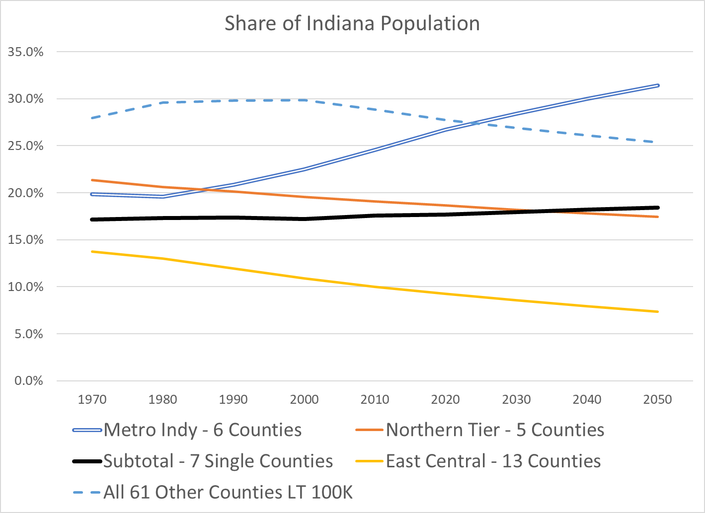 These 18 larger counties (of 92) have collectively driven almost all of the population growth in Indiana for the last 30 years. These trends are expected to continue for the next 30 years.