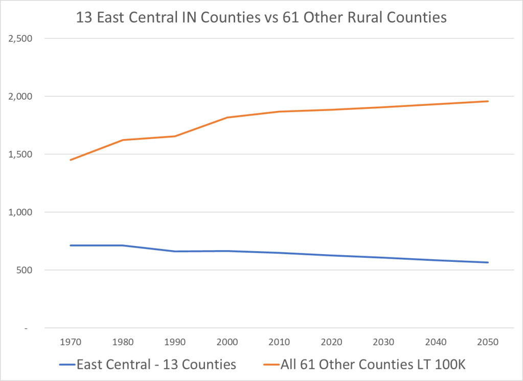 In the modern world, local economies must find “critical mass” in order to succeed. Metro Indy is doing well. The I-90 corridor near Notre Dame is surviving as are the other mini-metro areas. The other 74 counties are stagnant.