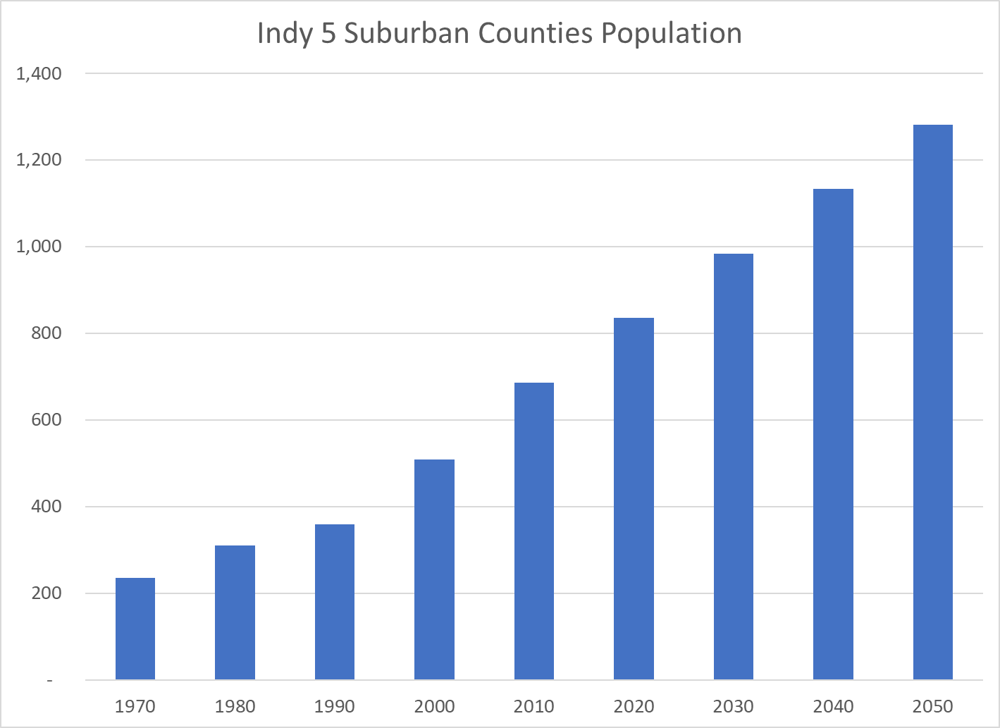 Indy’s suburbs were immaterial in 1970, but have grown to be nearly as large as the main city in 2020.
