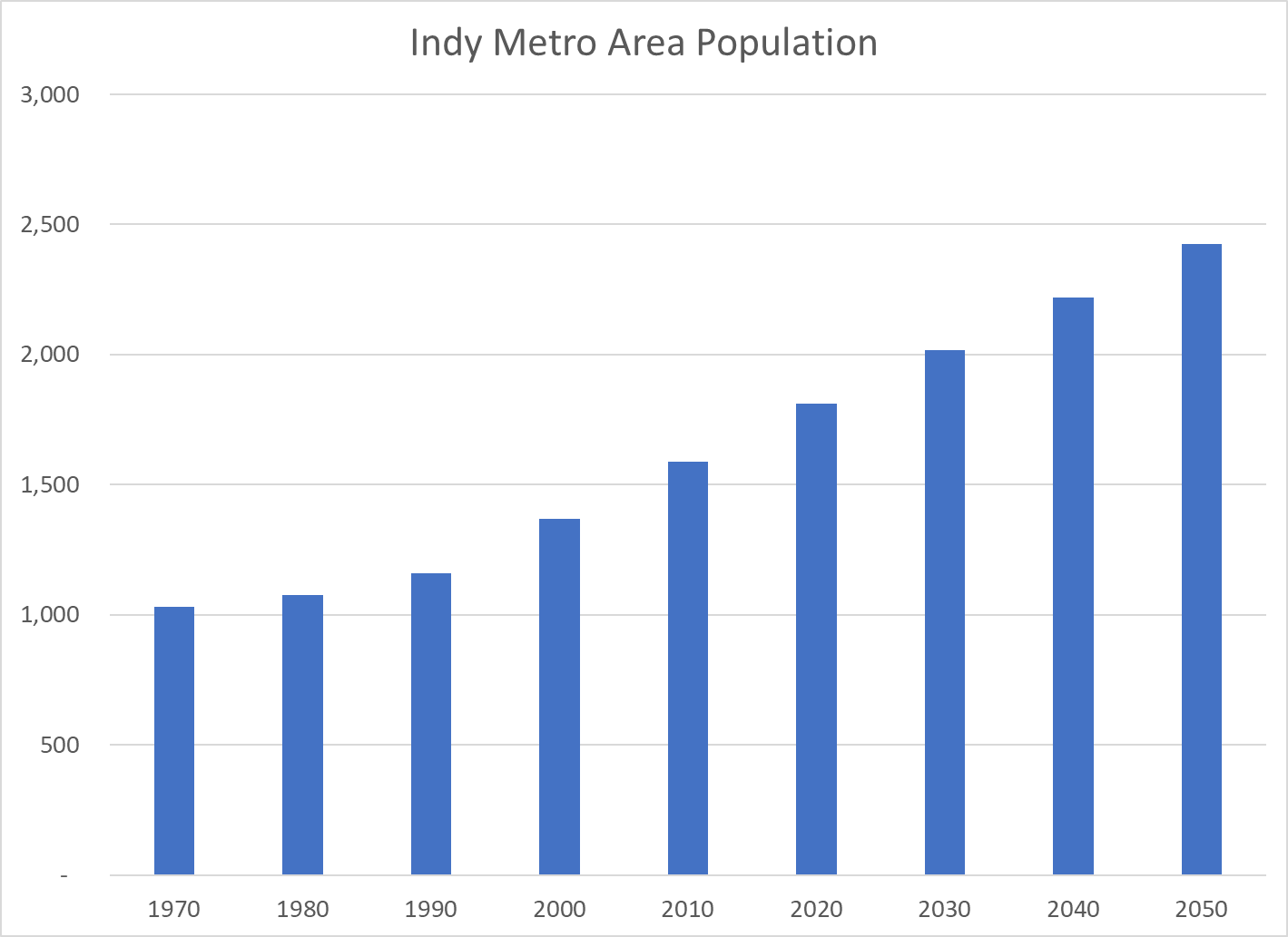 The total Indy metro area grew by 80% from 1990 to 2020 and is expected to grow at the same rate for the next few decades.