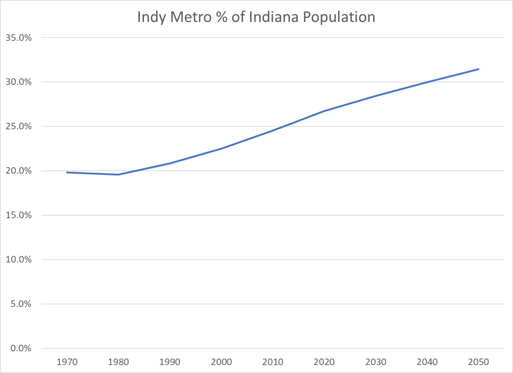 Like metro areas across the country, Indianapolis has grown much faster than the rural counties of Indiana.