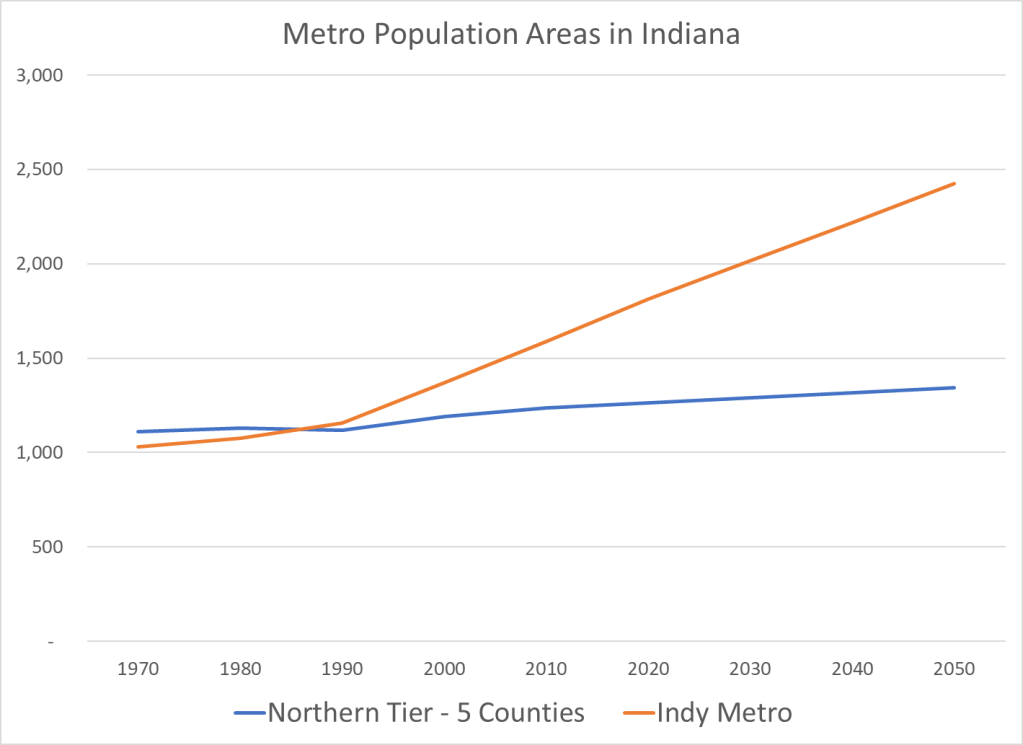 The I-90 corridor’s population was the same size as metro Indianapolis from 1970-1990, but their growth paths diverged afterwards.