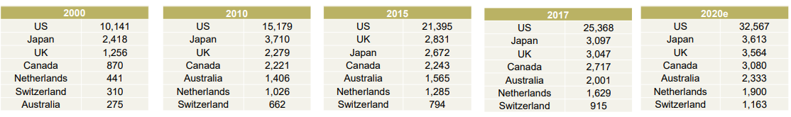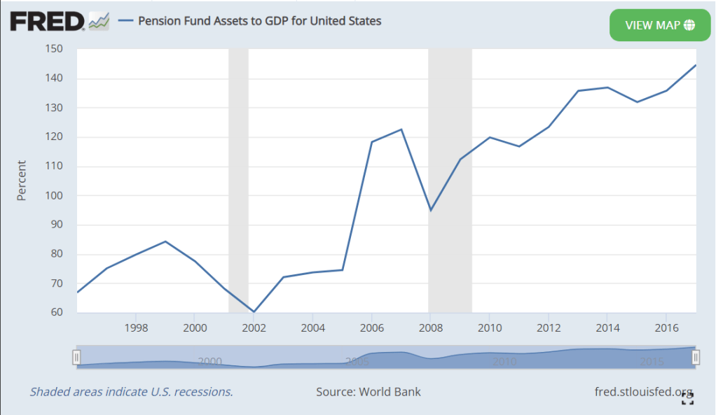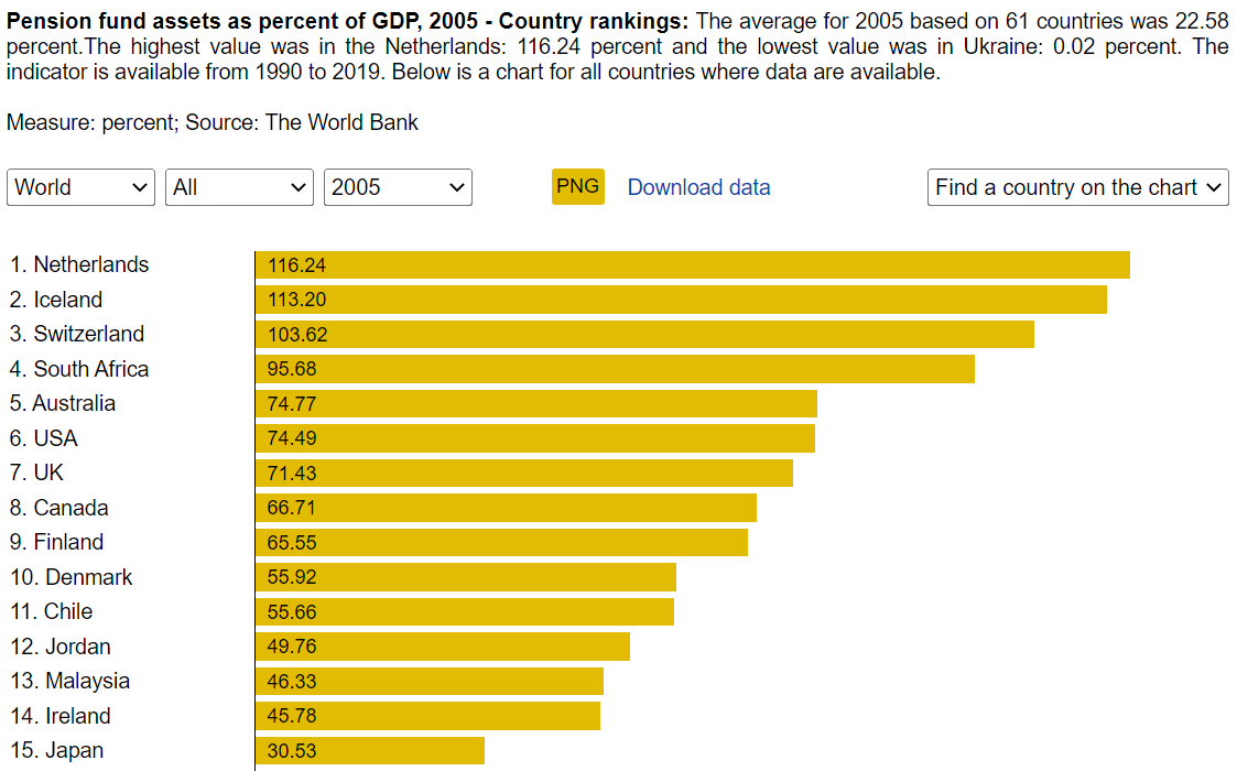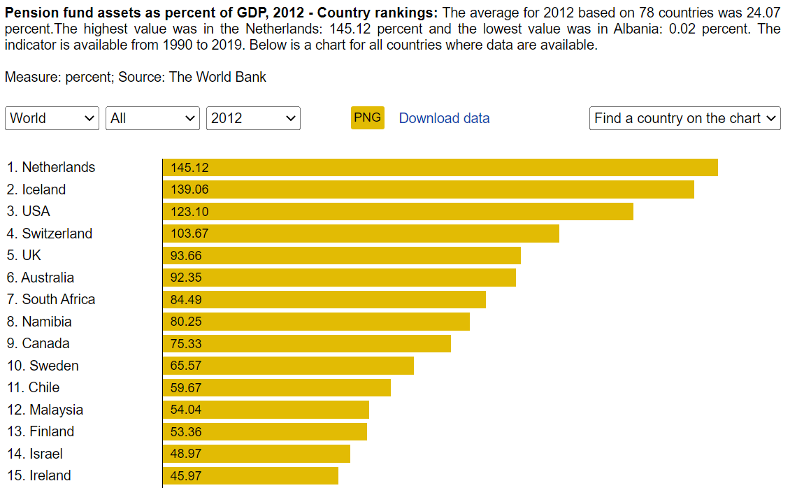 The US ratio of plan assets to GDP is typically 5th out of the 30-50 countries tracked by the World Bank.