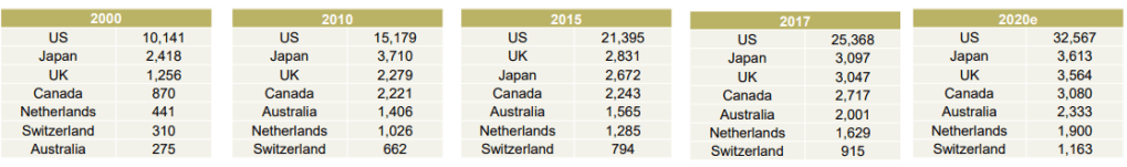 US plan assets as a percentage of GDP grew from just above 100% in 2010 to 157% in 2020. US plan assets from 1996-2005 averaged just 70% of GDP, so the relative amount of savings has doubled from 2005 to 2020.
