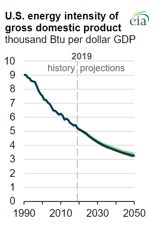 Energy intensity is down as the service economy becomes a greater share of GDP, energy efficiency improves for consumer and industrial uses, electricity power grows with its inherently higher efficiency, and renewable energy grows as a source of power.