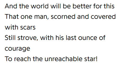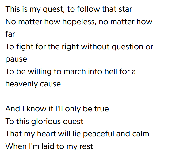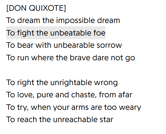 Jim Nabors’ rendition of “The Impossible Dream” on the 1965 Gomer Pyle, USMC show is a great place to start. We’ve become too practical, skeptical, secular and cool to consider this or any similar view on life, derived from the classic 1615 novel Don Quixote. Enjoy!